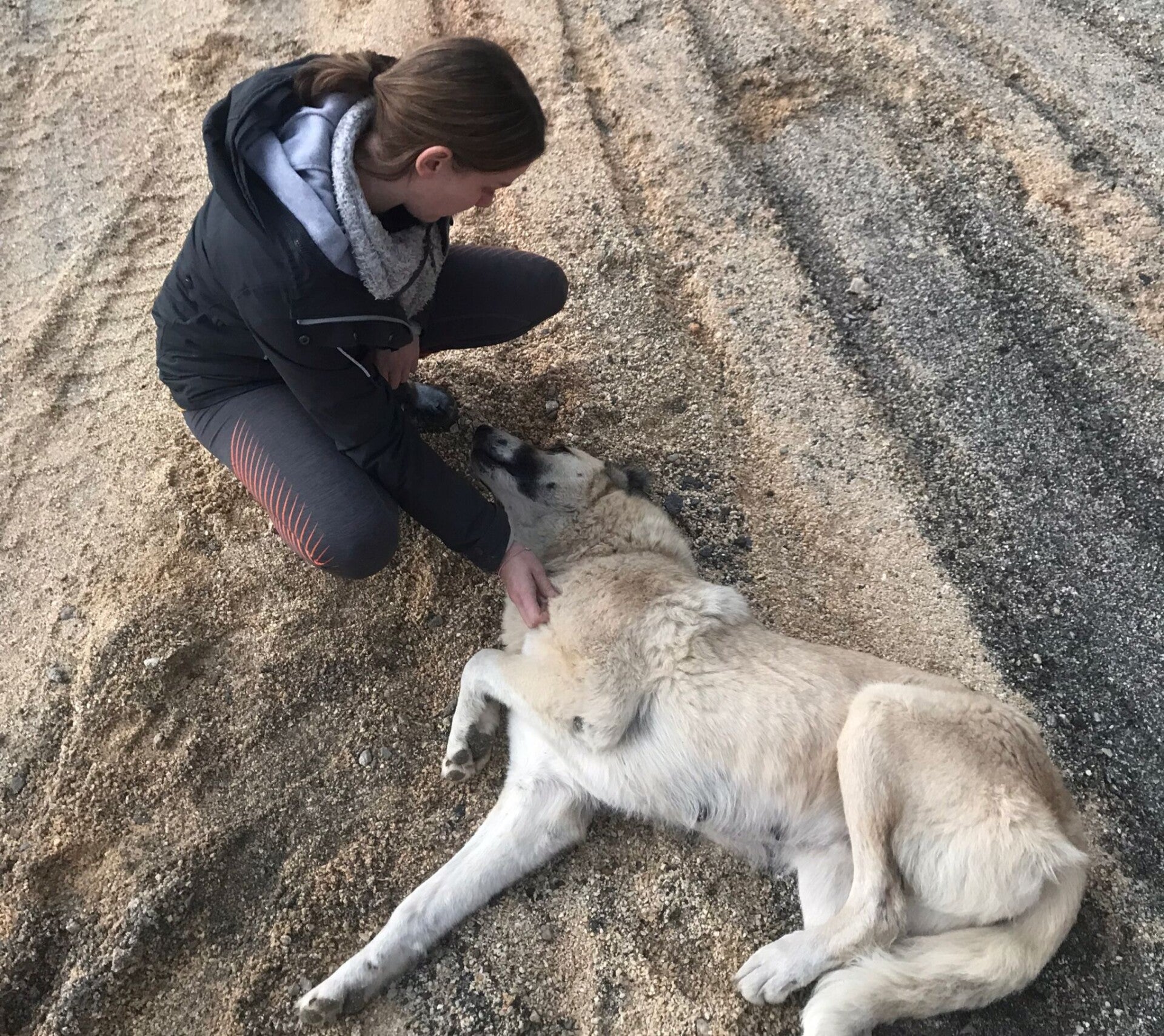 Sehr menschenbezogen, lieb, ruhig, freundlich. In dem Dorf, in dem sie lebt, ist es nicht mehr sicher, denn jederzeit kann die Stadt kommen und die Hunde dort einsammeln. Die Leute wollen teilweise die Hunde nicht mehr dort. Und eine stark befahrene Straße führt direkt an dem Hundeplatz vorbei.